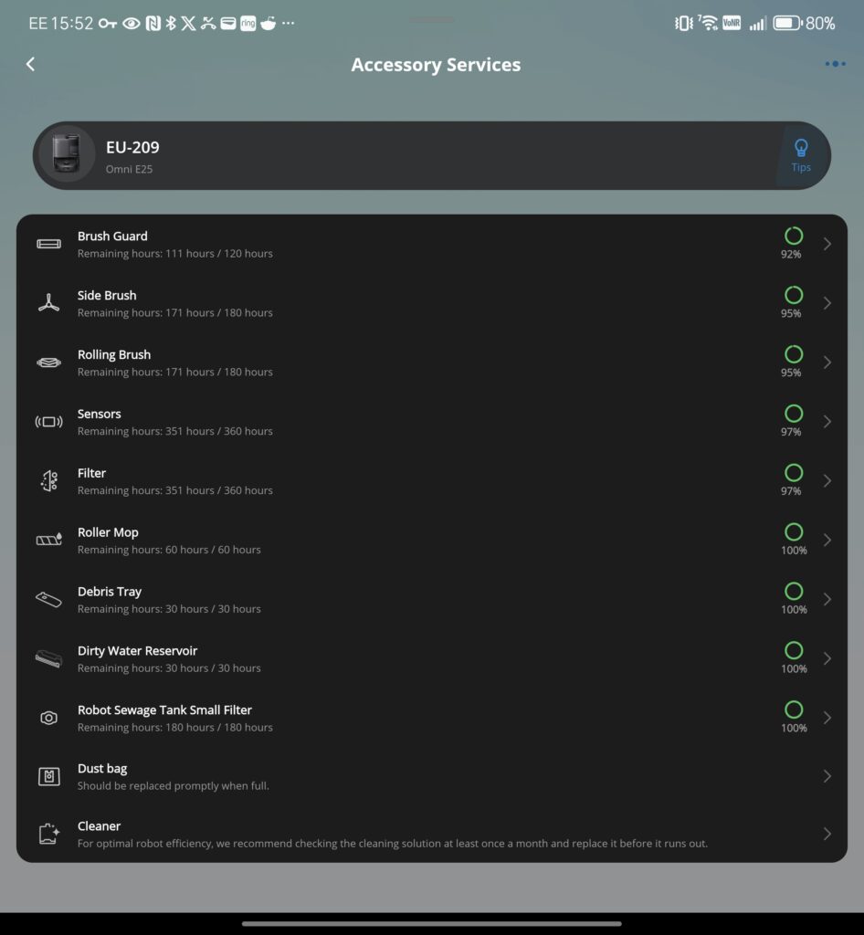 Maintenance and usage tracking are also well covered. The Eufy app tracks the lifespan of consumables like the dust bag, filter, mop roller and brushes. You can see exactly how many hours or cycles remain, with reminders when replacements are due. The app estimates each 3-litre dust bag lasts about 75 days, depending on usage.